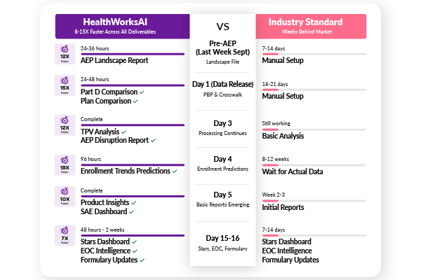 We transform CMS releases into predictive insights like *Top winners vs. losers, *SNP shifts, *Top geographies, *SAE/SAR up to 15X faster than industry norms.