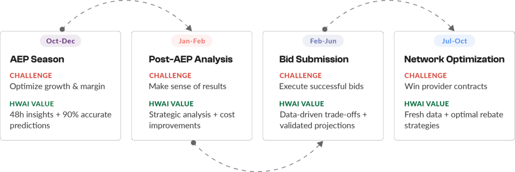 A conversational interface trained on HWAI comprehensive Medicare Advantage market data, competitive intelligence, and regulatory insights. Leadership teams simply ask natural language questions and receive immediate, context-rich responses.